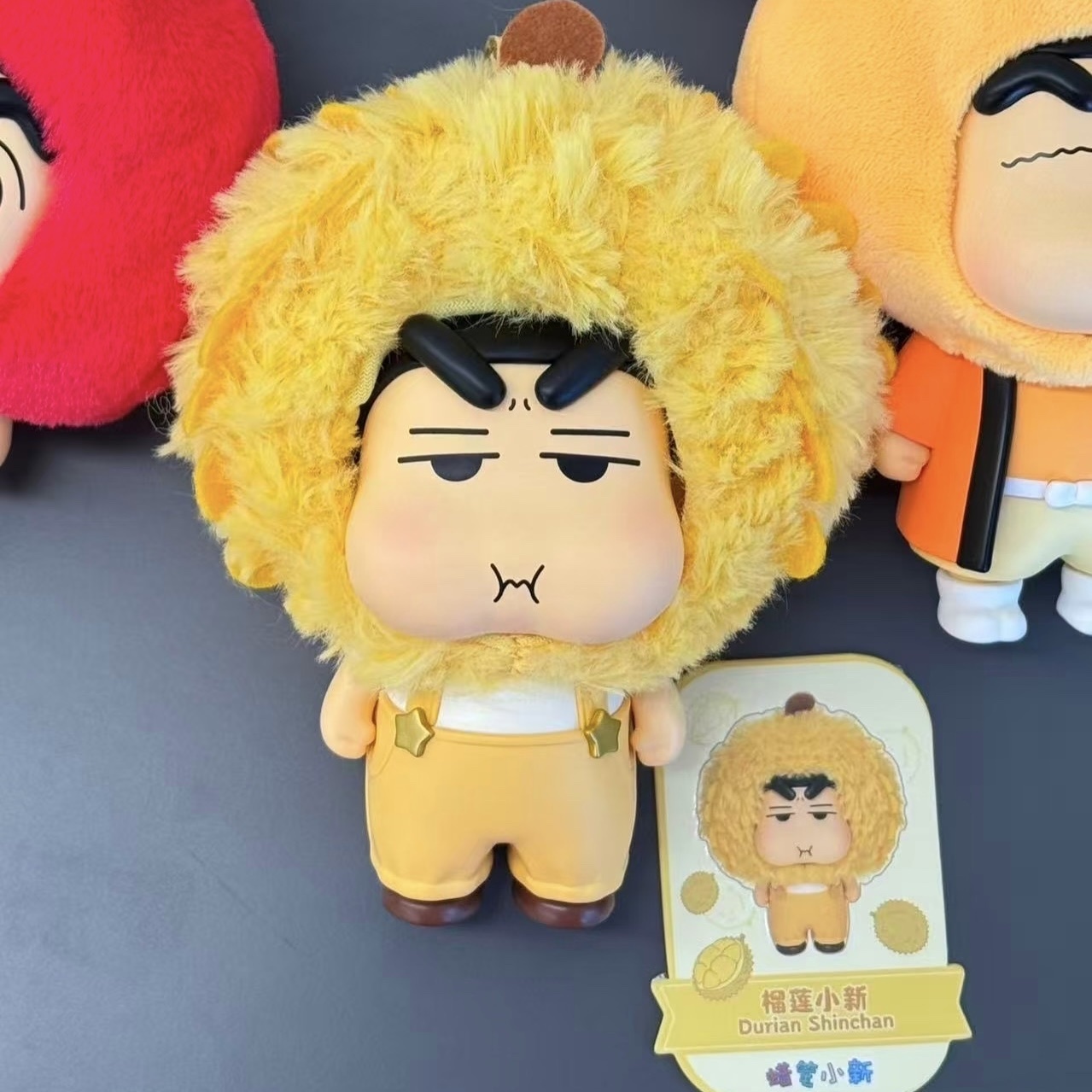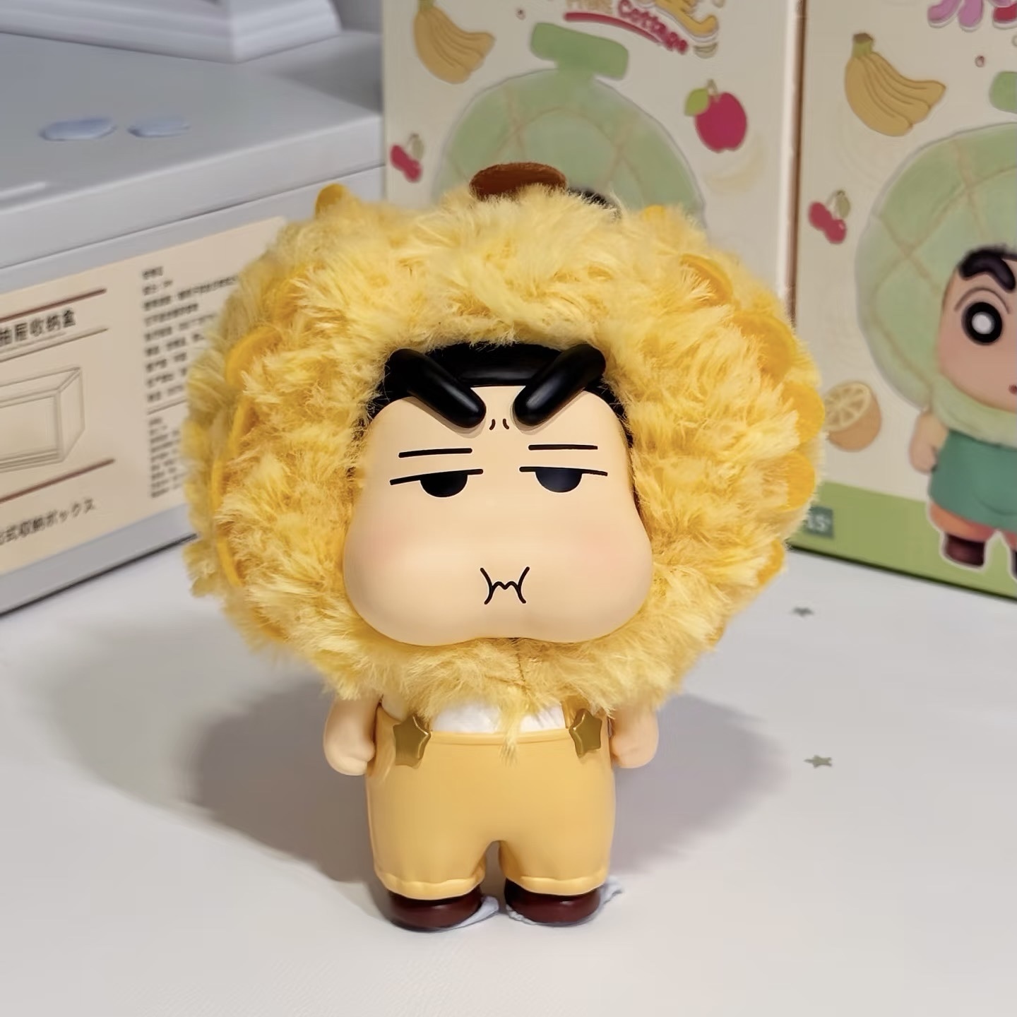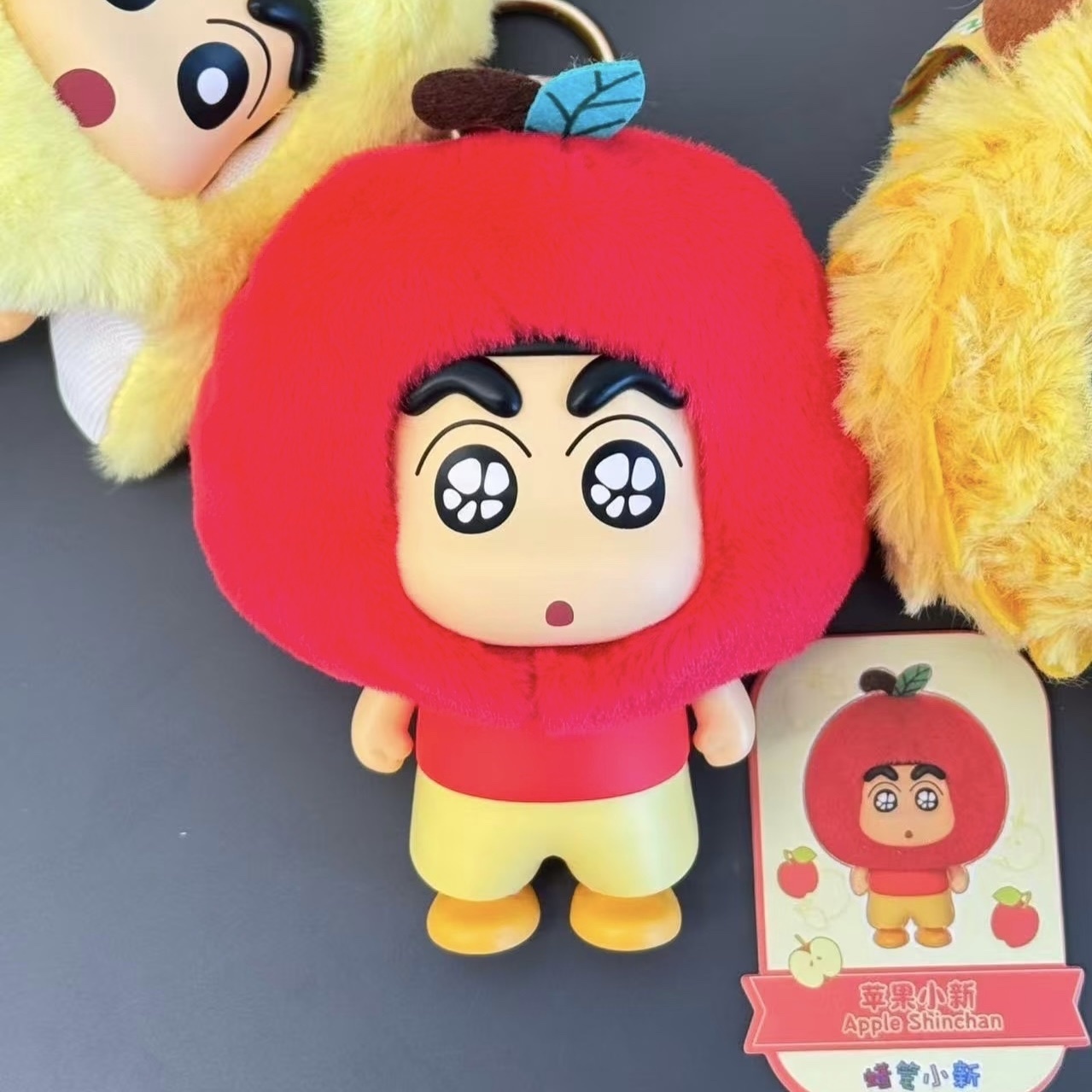 -造型特色:小新頭戴水果「屋頂」造型的頭套,頭套可穿脫。